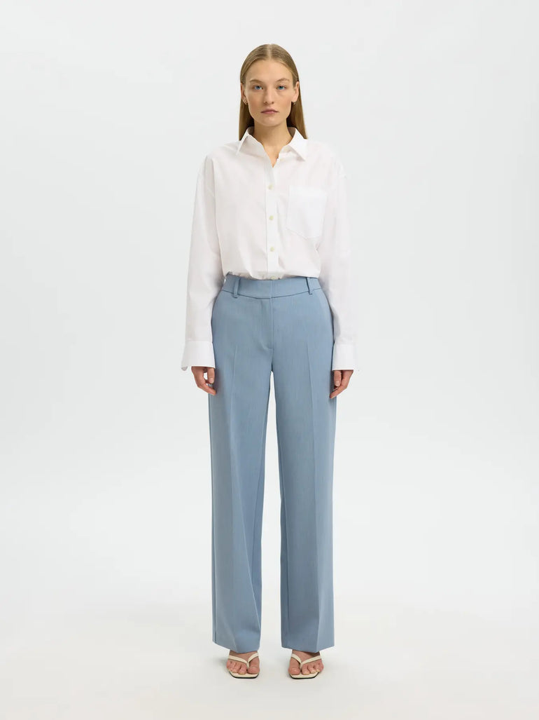 Gi basegarderoben din en oppdatering med de elegante Rita Wide Pants fra Selected Femme. Disse buksene i dyp marineblå farge med løs passform gir et moderne og elegant uttrykk. Den minimalistiske designet og de rene linjene gjør disse buksene til et allsidig plagg som kan styles til enhver anledning og kan enkelt dresses opp eller ned. Kombiner dem med en skjorte og blazer for en profesjonell look på kontoret, eller med en enkel t-skjorte og sneakers for en mer avslappet stil.