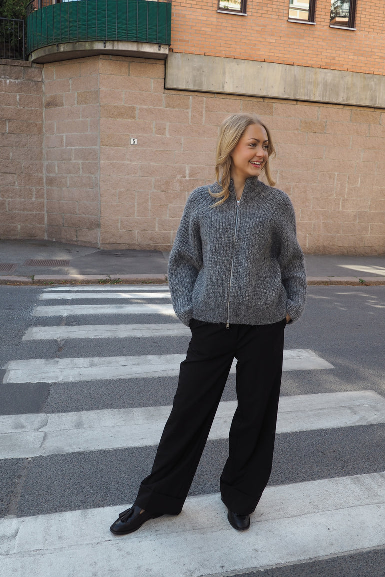 - Lukkes med glidelås som kan trekkes både opp og ned